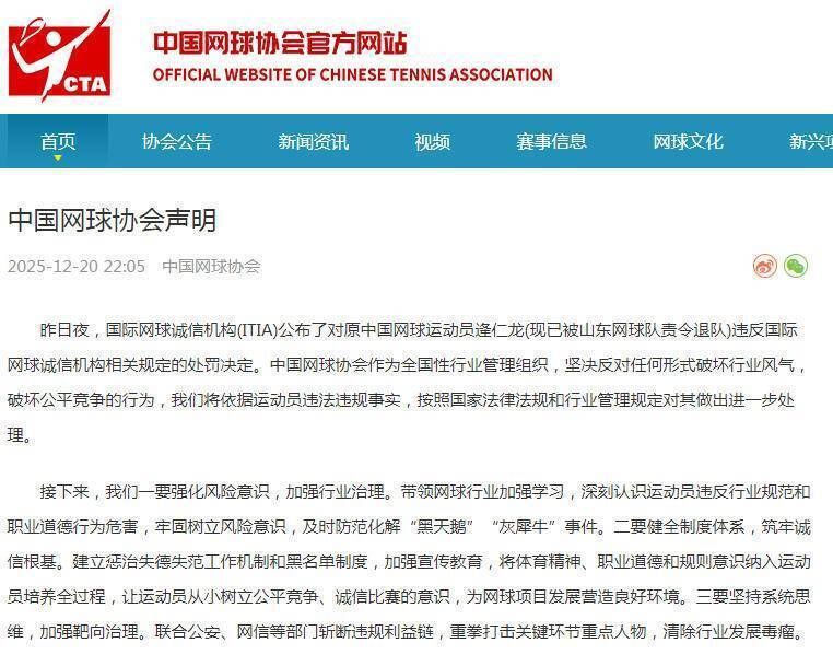 2025-12-23中国网球公开赛,中网2025,China Open网球,中网赛程,中网签表,中网直播/全面聚焦2025中国网球公开赛(China Open)赛程、签表、比分直播、冠军赔率及选手动态,打造中文网球资讯首选平台。中国网坛再掀波澜,诚信警钟再次敲响。国际网球诚信机构(ITIA)近日宣布,对中国网球运动员逄仁龙处以重罚,禁赛长达12年,并处以11万美元的罚款,其中一部分暂缓执行。这一严厉处罚,无疑给正处于上升期的中国网球蒙上了一层阴影。