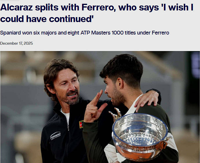 费雷罗从阿尔卡拉斯在青少年时期就开始执教他,两人合作期间,阿卡夺得了六座大满贯冠军奖杯并登顶ATP世界第一,可谓感情深厚。没成想,在新赛季即将开始之际,两人突然分手,惊诧了世界网坛。