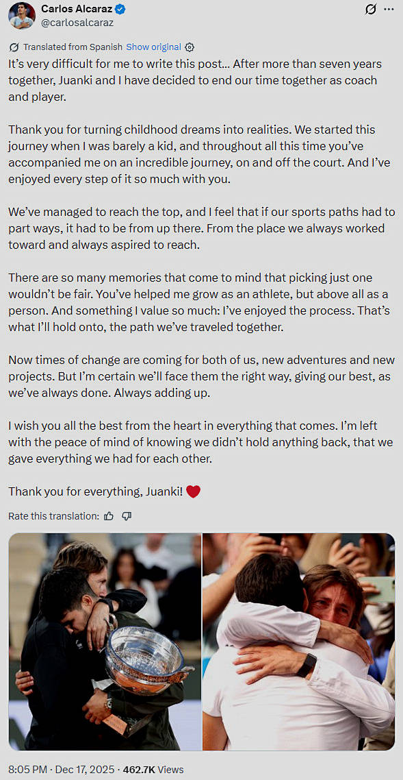 我们再来关注一条突发消息。北京时间昨晚,世界第一阿尔卡拉斯在个人社交媒体突然发表声明,宣布与自己的主教练、自己的亚父费雷罗结束7年多的合作,两人就此分道扬镳。随后,费雷罗也发声明,证实了与自己的爱徒分手的消息,并表达了留恋之情。
