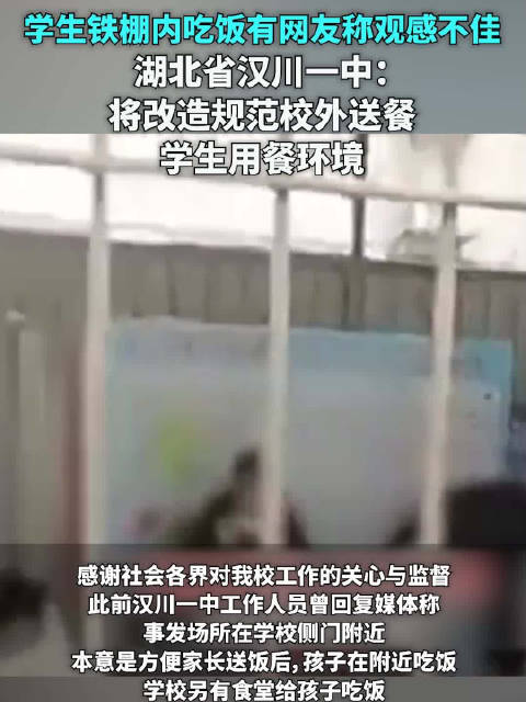 学生铁棚内吃饭,有网友称观感不佳。湖北汉川一中:将改造规范校外送餐学生用餐环境。