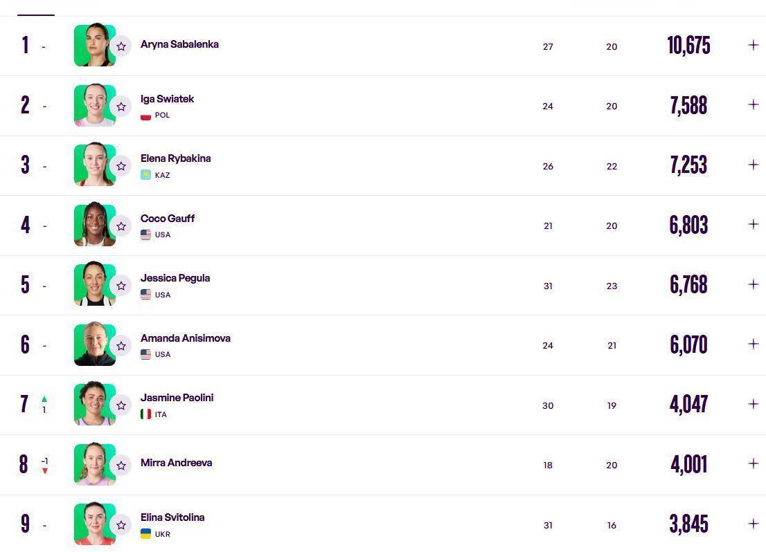 安德列娃,这期她掉到了第8。 她是迪拜站的卫冕冠军,但这次在四分之一决赛就被阿尼西莫娃逆转了,卫冕失败。 安德列娃才18岁,姆博科19岁,现在TOP10里有两个是青少年球员,这情况是2009年阿扎伦卡和沃兹尼亚奇之后头一回。 但另一边,佩古拉、保利尼、斯维托丽娜也都30岁了。 前十里面,老将和小将各占了一半。